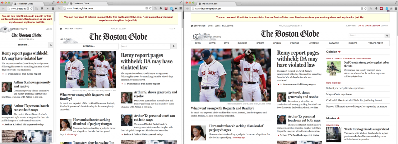 Enlarge / The Boston Globe website at phone, tablet, and desktop sizes.
