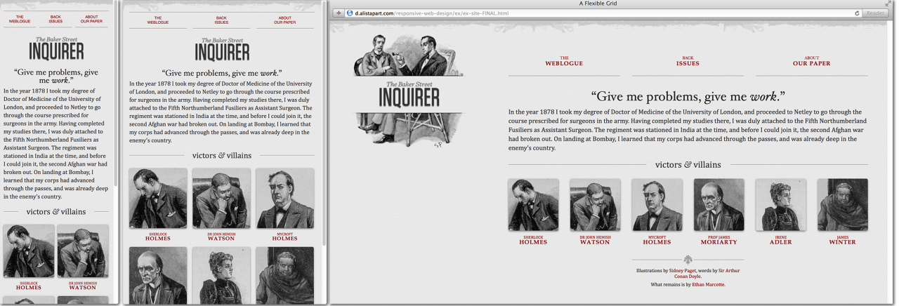 Enlarge / Ethan Marcotte's original responsive demo site at roughly phone, tablet, and desktop screen sizes.